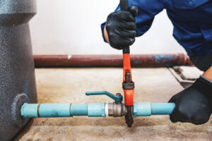 - Technician plumber using a wrench to repair a water pump pipe. Concept of maintenance, fix water plumbing leaks drop or house bathroom service or cleaning clogged pipes is dirty or rusty.
